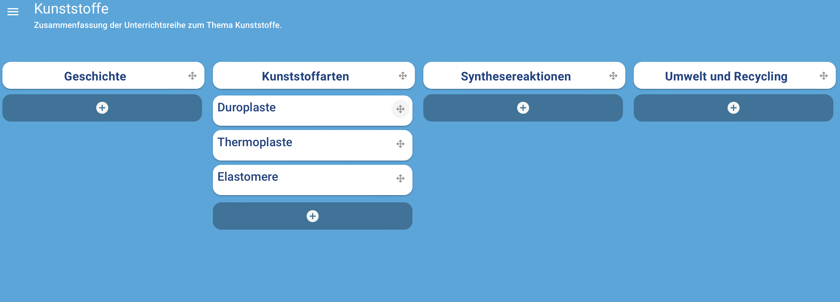 - Karten hinzufügen: Später sollen die Schüler*innen die Inhalte in Karten anlegen. Die Kategorie „Kunststoffarten“ wollen wir vorkategorisieren und legen daher drei Karten mit den Überschriften „Duroplaste“, „Thermoplaste“ und „Elastomere“ an. Dies können Sie wieder durch klicken auf „+“ in dieser Spalte tun.