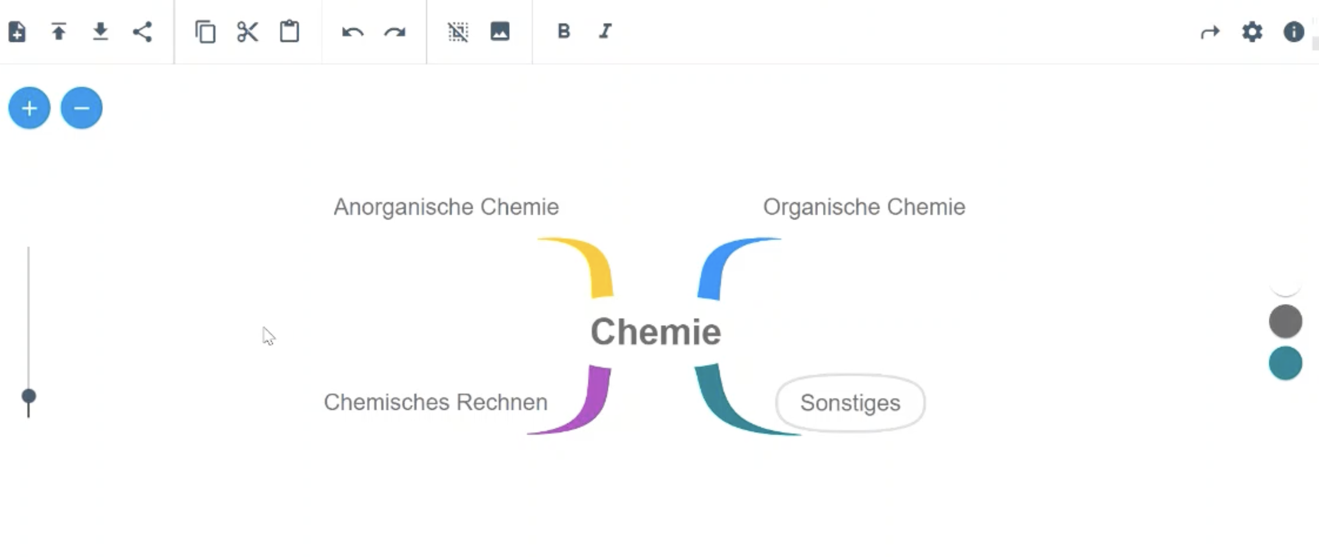 - Ebenen hinzufügen: Klicken Sie auf das „+“ im blauen Kreis oben links, um einen Punkt zur Mindmap hinzuzufügen und nennen Sie Ihn „Anorganische Chemie“. Klicken Sie nun wieder auf das zentrale Feld und fügen Sie über „+“ drei weitere Felder hinzu mit den Titeln „Organische Chemie“, „Chemisches Rechnen“ und „Sonstiges“.